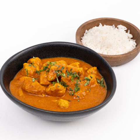 Pollo tikka masala cocinado en salsa de jitomate con yogurt, mantequilla y especias, acompañado de arroz basmati cocido en fondo de verduras.