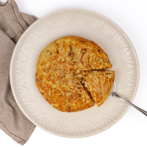 Tortilla de patatas tradicional con papa, huevo y un toque de cebolla y pimiento, logrando una textura suave y un sabor profundo.
