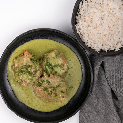 Tortitas de carne preparadas con res y huevo, cocidas en salsa verde de jitomate, ajo y cilantro, acompañadas de arroz basmati cocido en fondo de verduras.